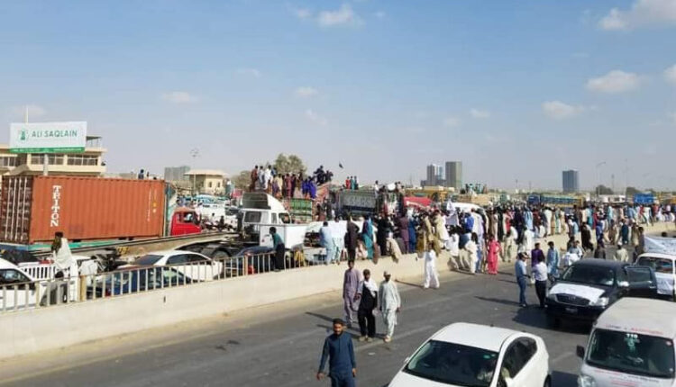 کراچی: سپر ہائی وے پر فارم ہاؤسز گرانےکے خلاف کارروائی پر احتجاج کے باعث ٹول پلازہ کے اطراف کے دونوں ٹریک بند کردیے گئے۔