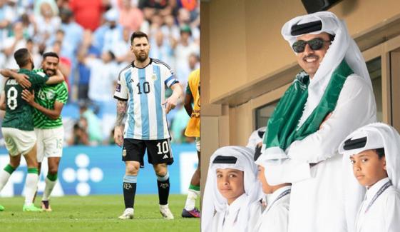 فیفا ورلڈکپ 2022 میں ارجنٹینا کیخلاف سعودی عرب کی کامیابی پر امیر قطر شیخ تمیم بن حمد بن خلیفہ الثانی نے سعودی پرچم پہن کر جشن منایا۔