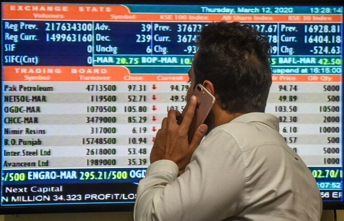 پاکستان اسٹاک ایکسچینج پی ایس ایکس میں حصص کی فروخت کا شدید دباؤ دیکھا جارہا ہے اور کاروبار کے دوران بینچ مارک کے ایس ای 100 انڈیکس میں ایک ہزار 800 پوائنٹس سے زائد کی کمی دیکھی گئی۔