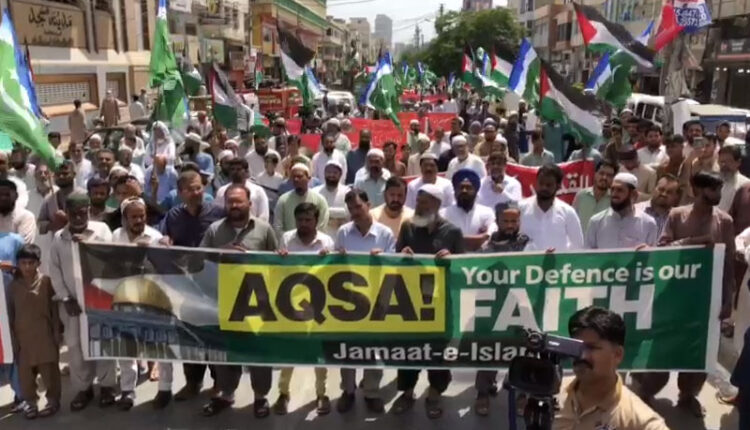 امیر جماعت اسلامی پاکستان سراج الحق کی اپیل پر اسرائیلی افواج کی جانب سے اہل فلسطین پر ظلم ومسجد اقصیٰ کی بے حرمتی کے خلاف یوم یکجہتی فلسطین کے سلسلے میں کراچی کے شہریوں نے فلسطینی مسلمانوں پر بمباری کے خلاف شدید غم و غصے کا اظہار کیا اور فلسطینی مسلمانوں سے اظہار یکجہتی کیا، مظاہرے کے شرکاء نے ہاتھوں میں بینرز، پلے کارڈز اور فلسطینی پرچم بھی اٹھائے ہوئے تھے جن پر تحریر تھا کہ قبلہ اول کی آزادی عرب و عجم کا نہیں پوری امت مسلمہ کے ایمان کا مسئلہ ہے۔