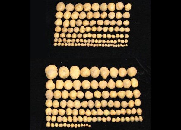 (اس تصویر کے نچلے حصے میں آر این اے میں تبدیلی سے اُگائے گئے آلو دکھائے گئے ہیں جن کی جسامت اور مقدار عام آلوؤں سے نمایاں طور پر زیادہ ہے)