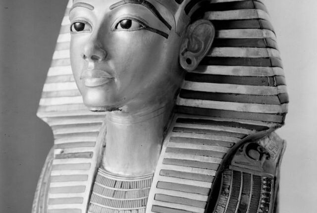 توتن خامون کے سونے کے ماسک کو، جسے یہاں داڑھی کے بغیر دیکھا جا سکتا ہے، فوٹوگرافر ہیری برٹن نے پیرافن ویکس سے ڈھانپ کر تصویر اتاری تاکہ روشنی کے اثرات کو مدھم کیا جا سکے