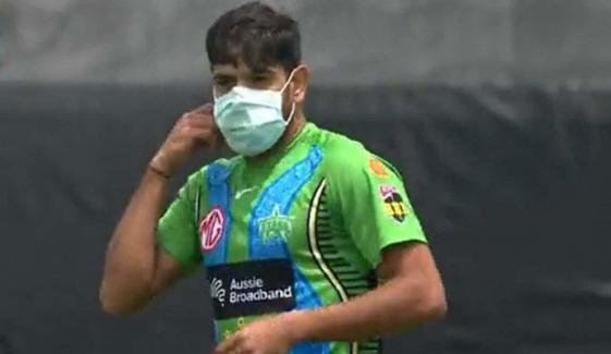 آسٹریلیا کی ٹی 20 لیگ بگ بیش میں حارث رؤف پرتھ اسکارچرز کے کھلاڑی کو آؤٹ کرنے کے بعد جشن کے لیے ماسک لے کر آئے۔