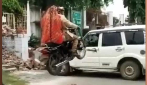 موٹرسائیکل کے آگے جیپ کھڑی ہوئی ہے، دولہا نے موٹرسائیکل اسٹارٹ ضرور کی لیکن اسے کرین نے اٹھا کر جیپ کے اوپر سے گزار کر واپس سڑک پر رکھ دیا۔
