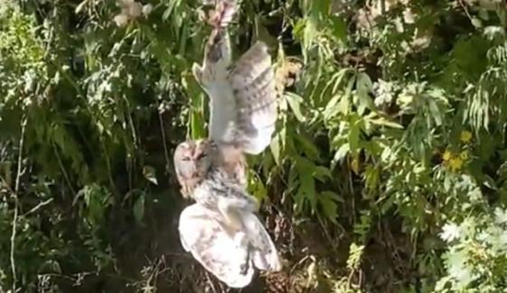 ویڈیو میں دریا کے قریب ایک درخت پر الو لٹکا ہوا نظر آرہا ہے، جس کے پر درخت کی کسی جھاڑی میں پھنس چکے ہیں اور وہ کافی پریشان بھی ہے۔