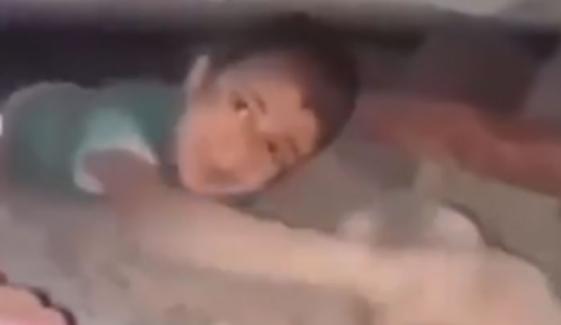 گزشتہ شب بھی غزہ کے رضا کار نے کنکریٹ میں دبے بچے کو اپنی جان پر کھیل کر زندہ نکالا، جس کی ویڈیو بھی سامنے آگئی، جس میں دیکھا جا سکتا ہے کہ ملبے میں دبے بچے کو جب باہر نکالا گیا تو وہ مسکراتے ہوئے باہر آرہا ہے۔