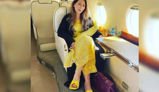 ٹوئٹر پر فہد مروت نامی ایک صارف نے فرح خان کی زرد لباس میں تصویر شیئر کی جس میں انہیں ایک جہاز میں سوار دیکھا جاسکتا ہے۔