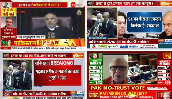 پاکستانی وزیرِ اعظم عمران خان کے خلاف تحریکِ عدم اعتماد کے سلسلے میں سپریم کورٹ کے حکم پر آج ہفتے کی صبح ساڑھے 10 بجے شروع ہونے والے قومی اسمبلی کے اجلاس کو پاکستان ہی نہیں بلکہ پڑوسی ملک بھارت میں بھی لائیو کوریج دی جا رہی ہے۔