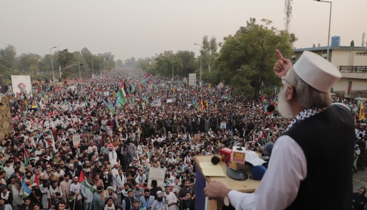 وفاقی دارالحکومت میں امریکی سفارت خانے کے قریب ایمبسی روڈ پر غزہ ملین مارچ سے خطاب کرتے ہوئے سراج الحق نے کہاکہ خواتین ادا کارائیں تک فلسطینیوں سے اظہار یکجہتی کر رہی ہیں مگر ہمارے حکمرانوں میں یہ دم خم نہیں ہے، غزہ کے لیے احتجاج کرنے والوں پراسلام آباد میں ڈنڈے گولیاں برسائی جاتی ہیں۔