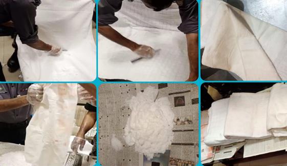 مسافر نے مذکورہ منشیات نہایت مہارت سے کلف لگے کپڑوں (احرام، تولیے اور واسکٹوں) میں چھپا رکھی تھی۔