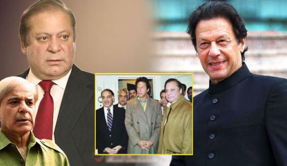 اس تصویر میں سابق وزیر اعظم نواز شریف، سابق وزیر اعظم عمران خان اور نو منتخب وزیر اعظم شہباز شریف کو ایک ساتھ کھڑے دیکھا جا سکتا ہے ۔