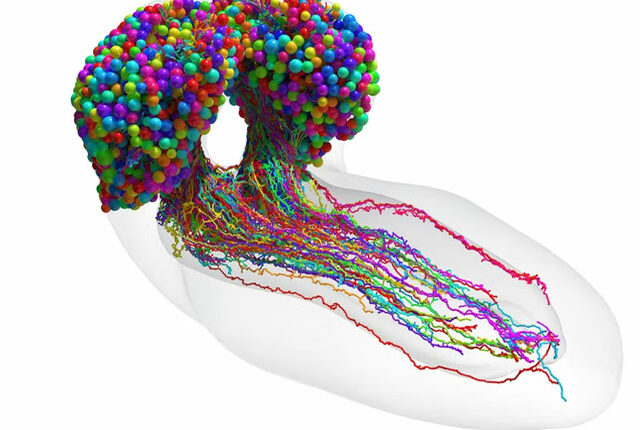یونیورسٹی آف کیمبرج اور جان ہوپکنز یونیورسٹی کے محققین کی جانب سے بنائے گئے اس خاکے میں مکھی کے دماغ کے ہر نیورون واضح دِکھایا گیا ہے اور یہ دِکھایا گیا ہے کہ یہ کس طرح ایک دوسرے سے جڑے ہیں۔