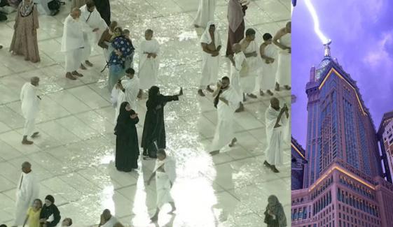 ایک ویڈیو میں طوفانی بارش کے دوران مکہ ٹاور کے اوپر بجلی چمکتی ہوئی بھی دیکھ جا سکتی ہے۔