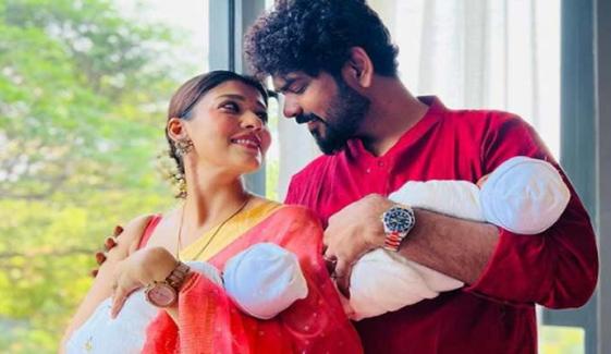 اس خوبصورت تصویر میں نین تارہ اور وگنیش نے ایّر اور الگام کو گود میں لے رکھا ہے۔