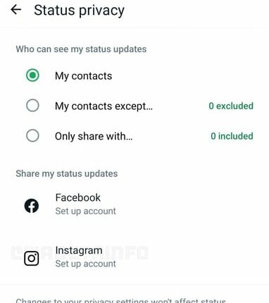 فی الوقت واٹس ایپ اسٹیٹس کو تین طریقوں سے شیئر کیا جاسکتا ہے: سب کے ساتھ، کچھ افراد کے علاوہ سب کے ساتھ یا منتخب افراد کے ساتھ۔