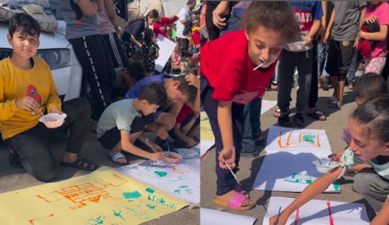 ویڈیو میں بچے ڈرائنگز بناتے نظر آرہے ہیں، جبکہ اسی دوران ان کے سروں کے اوپر سے ایک اسرائیلی جنگی جہاز کے گزرنے کی آواز بھی سنائی دیتی ہے۔