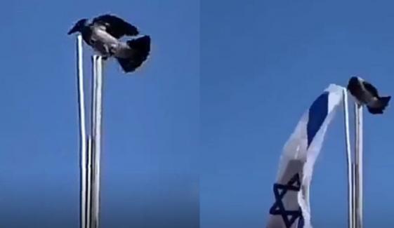 سوشل میڈیا پر ایک ویڈیو تیزی سے وائرل ہو رہی ہے جس میں پرندے کو اسرائیلی جھنڈا اتارتے ہوئے دیکھا جا سکتا ہے۔