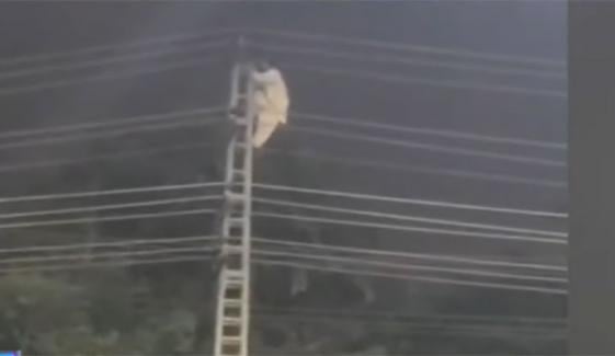 احتجاجی مظاہرے کے دوران پی ٹی آئی کا کارکن بجلی کے کھمبے پر بلندی پر پہنچا تو تاروں کی زد میں آگیا۔