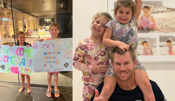 ڈیوڈ وارنر کا ویلکم کرنے کے لیے ان کی بیٹیوں نے ’فیملی، ویلکم ہوم ڈیڈ‘ کے پوسٹر بنائے، اور والد کے گھر آنے پر ان کا بھرپور استقبال کیا۔