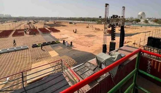 پنڈال میں کرسیاں لگادی گئیں جبکہ ساؤنڈ سسٹم لگایا جارہا ہے، جلسے کیلئے تیار اسٹیج کو دو حصوں میں تقسیم کیا گیا ہے۔