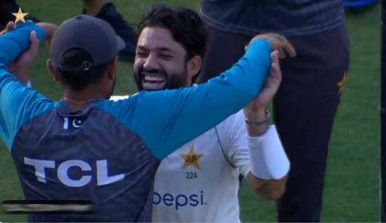 شکست ٹالنے میں اہم کردار ادا کرنے والے محمد رضوان میچ کے اختتام پر جب ڈریسنگ روم کی جانب آئے تو کپتان بابر اعظم سے بڑے جوش و خروش سے ہنستے مسکراتے گلے مِلے۔