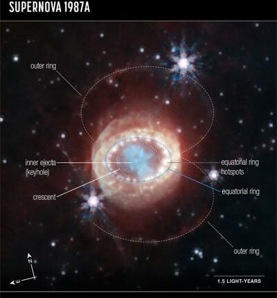 اطراف میں موجود اکوئیٹوریل رِنگ سپرنووا سے ہزاروں سال قبل خارج ہونے والے مادے سے بنا ہے۔ اس چھلے میں روشن ہاٹ اسپاٹ بھی موجود ہیں جو سپر نووا سے خارج ہونے والی شاک ویو ٹکرانے کے سبب وجود میں آئے ہیں۔